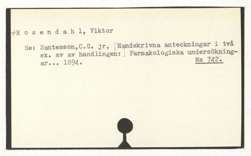 Se: Santesson, C.G. jr, [Handskrivna anteckningar i två ex. av av handlingen: ] Farmakologiska undersökningsar... 1894.