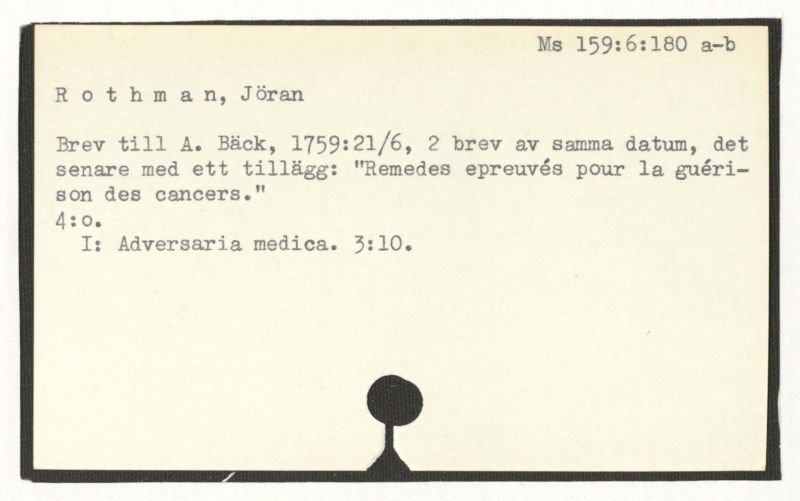 Brev till A. Bäck, 1759:21/6, 2 brev av samma datum, det senare med ett tilllägg: "Remedes epreués pour la guérison des cancers."