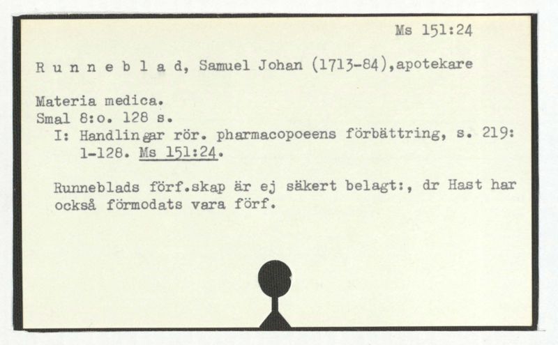 I: Handlingar rör. pharmacopoens förbättring, s. 219: 1-128. Ms 151:24.