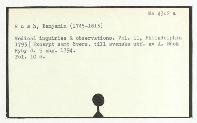 Medical inquiries & observations. Vol. 11, Philadelphia 1793 [Excerpt samt övers. till svenska utf. av A. Bäck] Ryby d. 5 aug. 1794.
