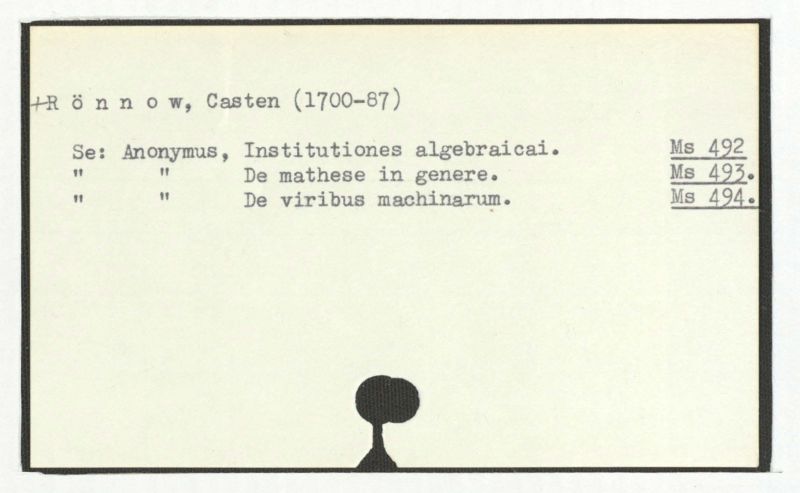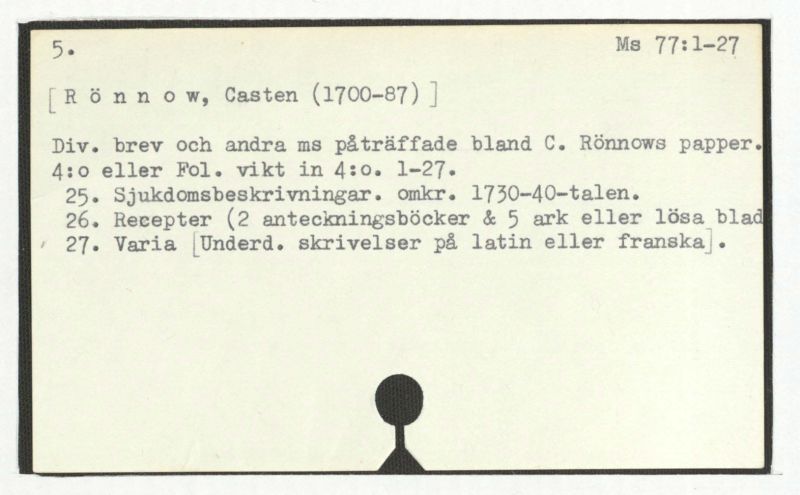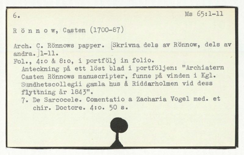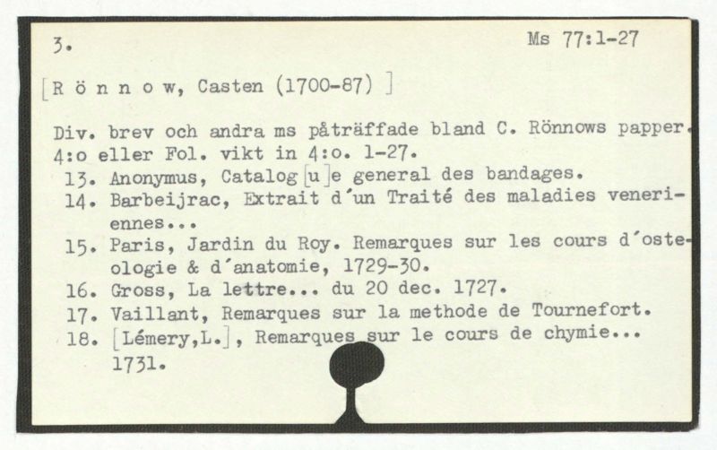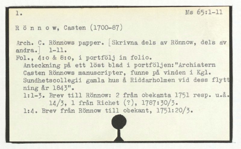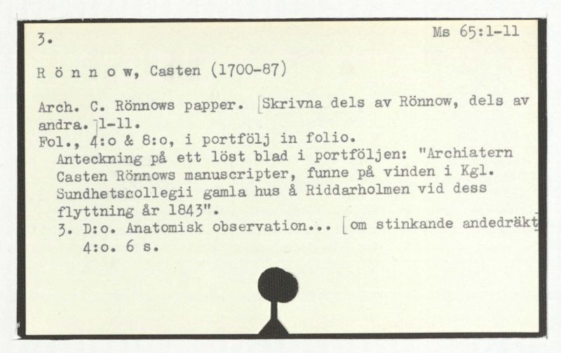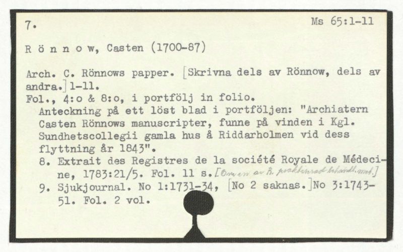 Anteckning på ett löst blad i portföljen: "Archiatern Casten Rönnums manuscripter, funne på vinden i Kgl. Sundhetscollegii gamla hus å Riddarholmen vid dess flytt ning år 1843"