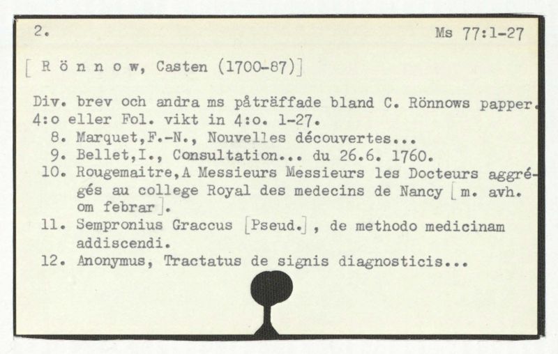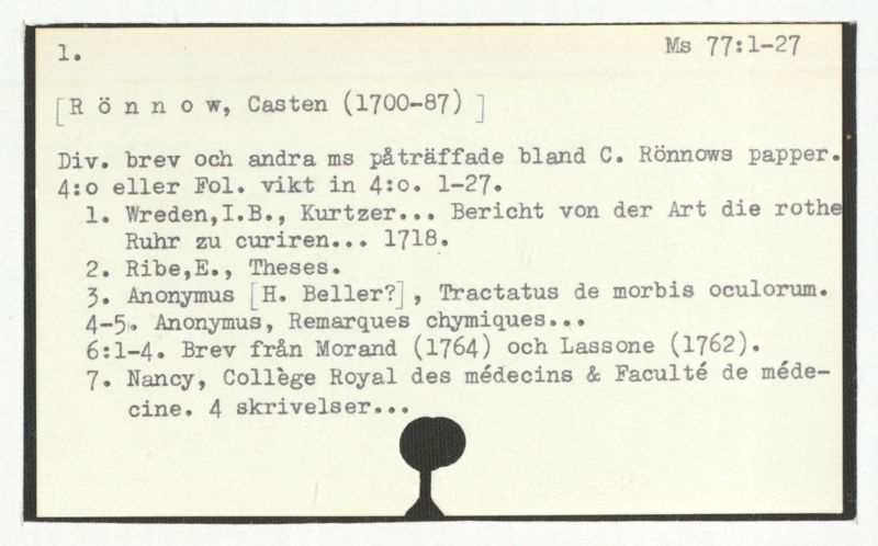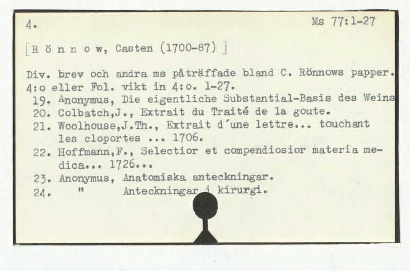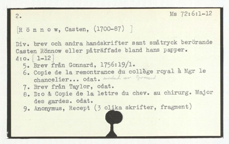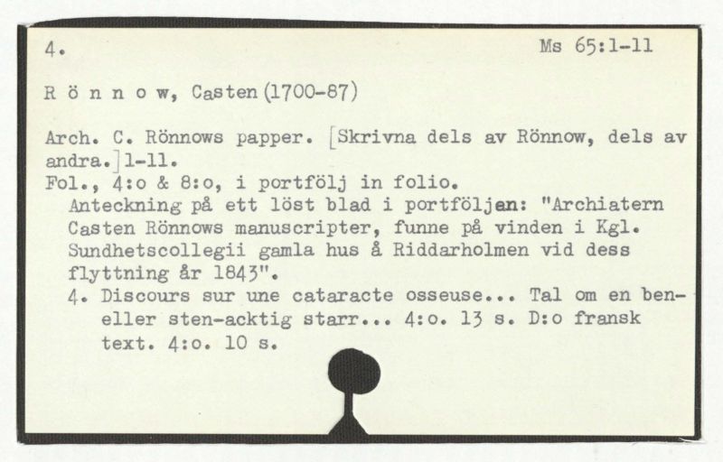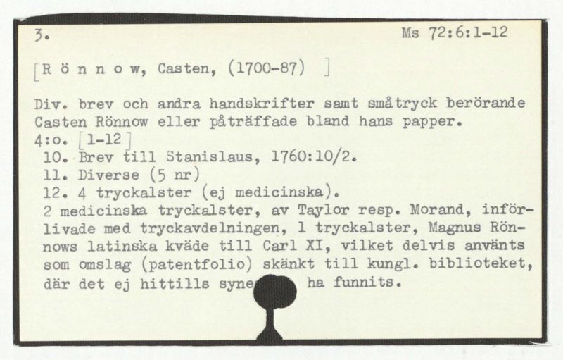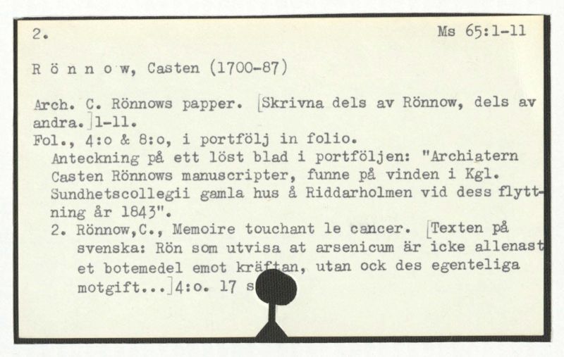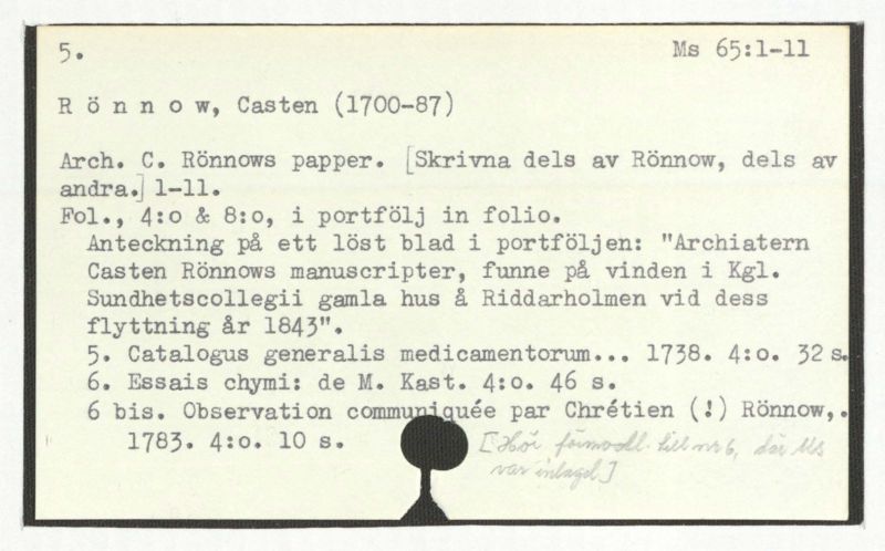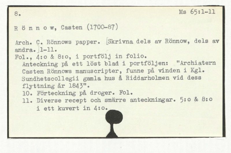 Anteckning på ett löst blad i portföljen: "Archiatern Casten Rönnows manuscripter, funne på vinden i Kgl. Sundhetscollegii gamla hus å Riddarholmen vid dess flyttning år 1843"