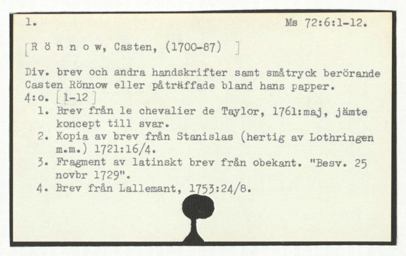 Div. brev och andra handskrifter samt småtryck berörande Casten Rönnow eller påträffade bland hans papper.