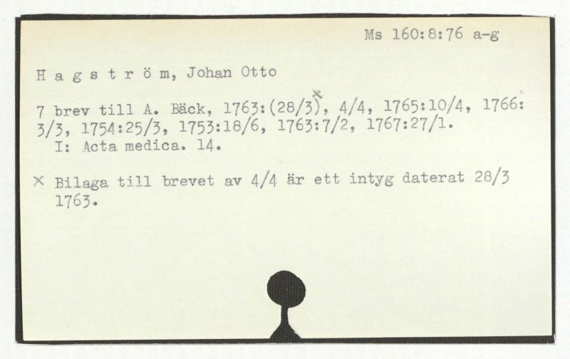 7 brev till A. Bäck, 1763:(28/3), 4/4, 1765:10/4, 1766: 3/3, 1754:25/3, 1753:18/6, 1763:7/2, 1767:27/1.