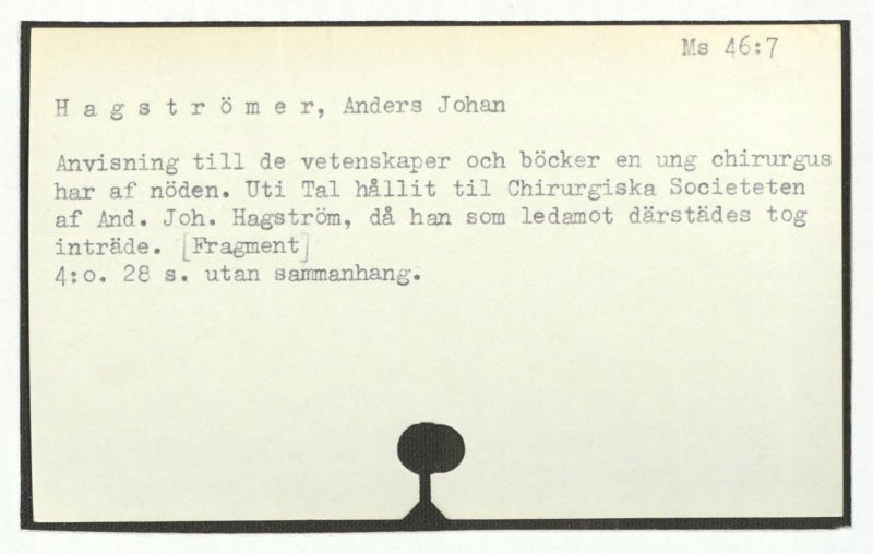 Anvisning till de vetenskaper och böcker en ung chirurgus har af nöden. Uti Tal hållit til Chirurgiska Societeten af And. Joh. Hagström, då han som ledamot därvstådes tog inträde. [Fragment]
