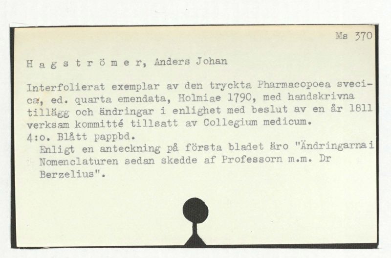 Interfolierat exemplar av den tryckta Pharmacopoeia svenska, ed. quarta emendata, Holmiae 1790, med handskrivna tillägg och ändringar i enlighet med beslut av en år 1811 verksam kommitté tillsatt av Collegium medicum.