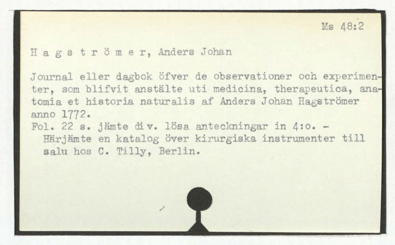 2. Hagströmer, Journal eller dagbok... anno 1772. – Tilly,C., Catalogus von chirurgischen Instrumenten.
