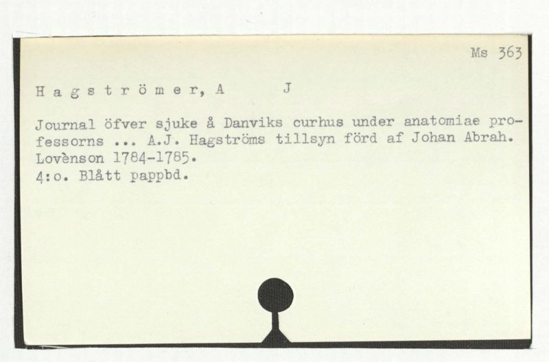 Journal öfver sjuke å Danviks curhus under anatomiae professors ... A.J. Hagströms tillsyn förd af Johan Abrah. Lovènsen 1784-1785.