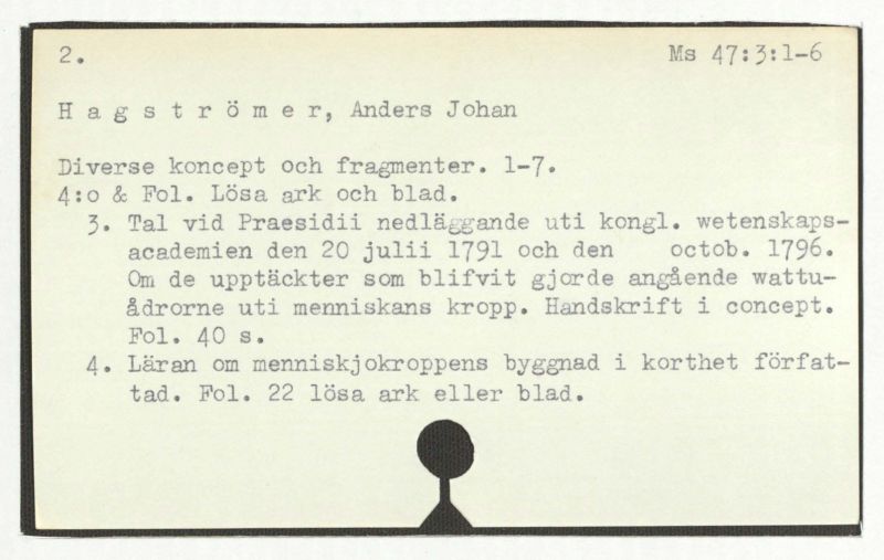 3. Tal vid Praesidii nedläggande uti kongl. wetenskapscacademi den 20 julii 1791 och den octob. 1796. Om de upptäckter som blifvit gjorde angående wattuådronne uti menneskans kropp. Handskrift i concept. Fol. 40 s.