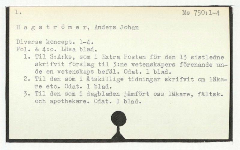 1. Självbiorgrafiska skrifter (jfr Ms 167) samt av andra författade biografiska anteckningar om Hagströmer.