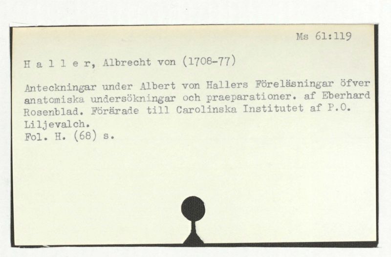 Anteckningar under Albert von Hallers Föreläsningar över anatomiska undersökningar och praeparationer. af Eberhard Rosenblad. Förärade till Carolinska Instituten af P.O. Liljevalch.
