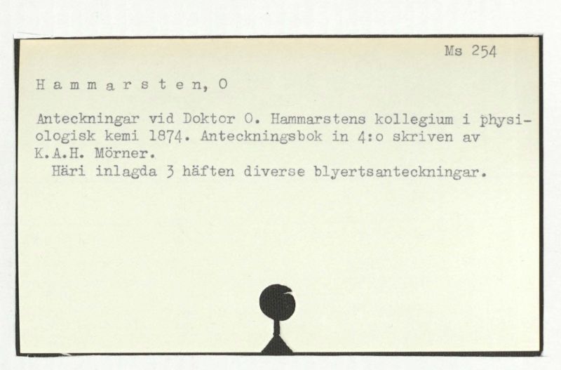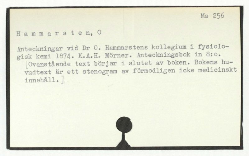Anteckningar vid Doktor O. Hammarstens kollegium i physiologisk kemi 1874. Anteckningsbok in 4:o skriven av K.A.H. Mörner.