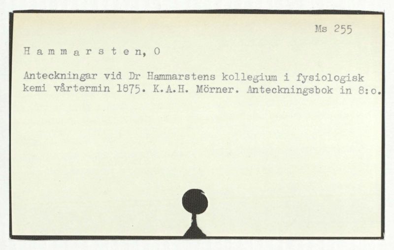 Anteckningar vid Dr Hammarstens kollegium i fysiologisk kemi vårtermin 1875. K.A.H. Mörner. Anteckningsbok in 8:0.