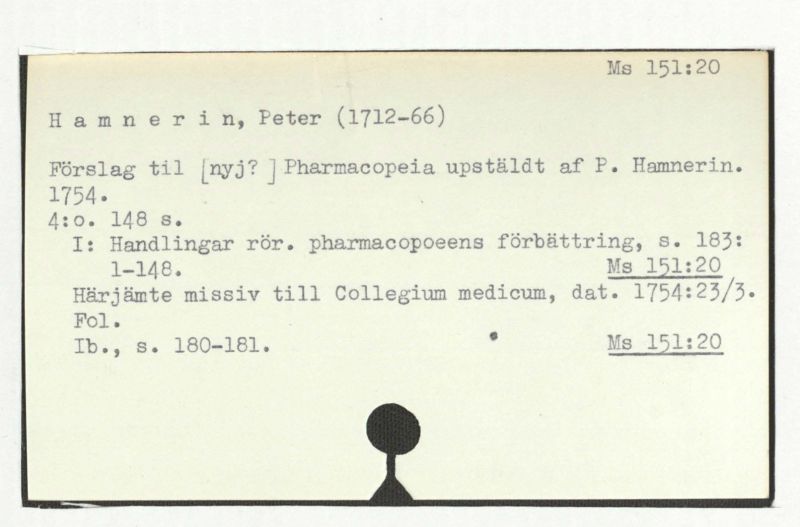 Förslag till [nyj?]Pharmacopeia upställdt af P. Hammerin. 1754.