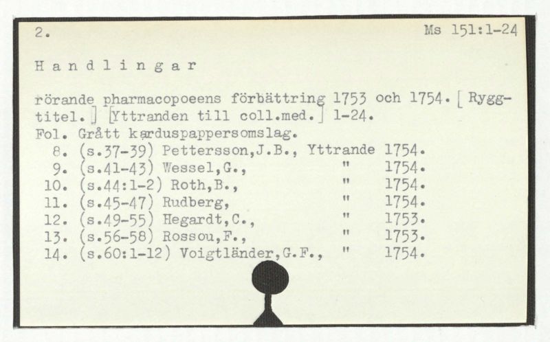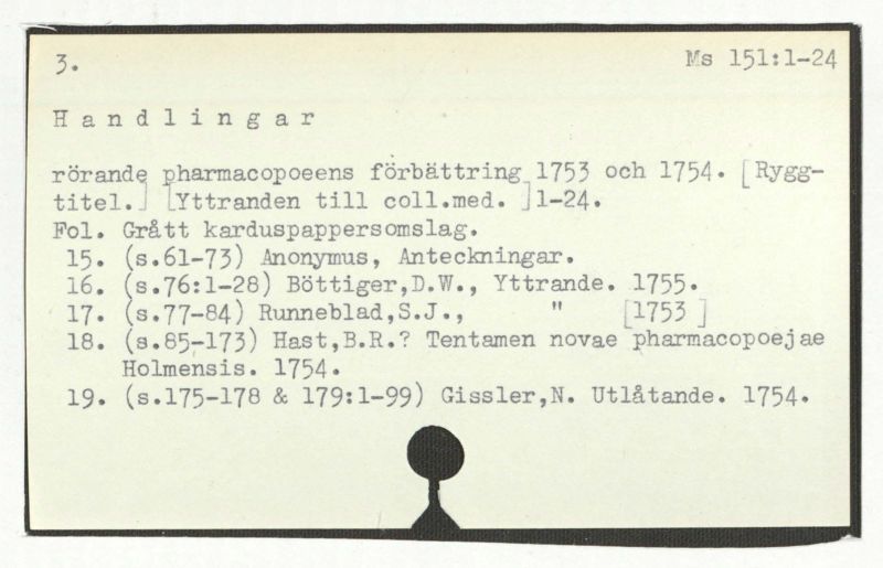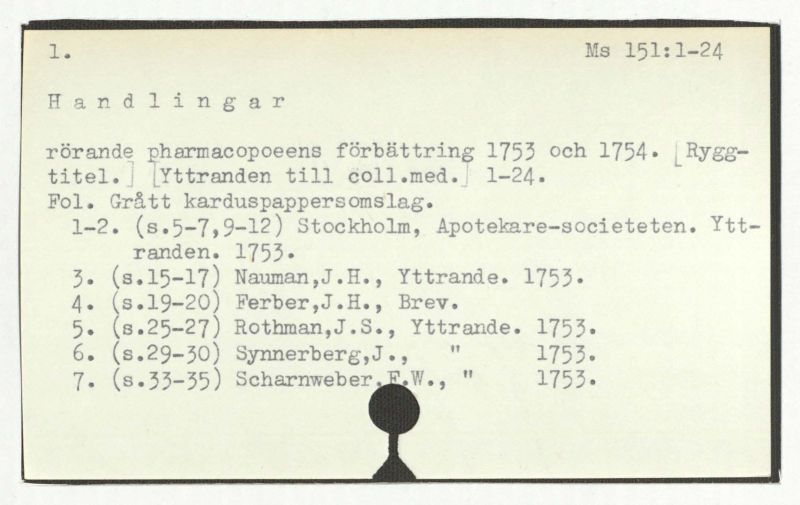 rörande pharmacopeiens förbättring 1753 och 1754. [ Ryggtitel. ] [Yttranden till coll.med. ] 1-24.
