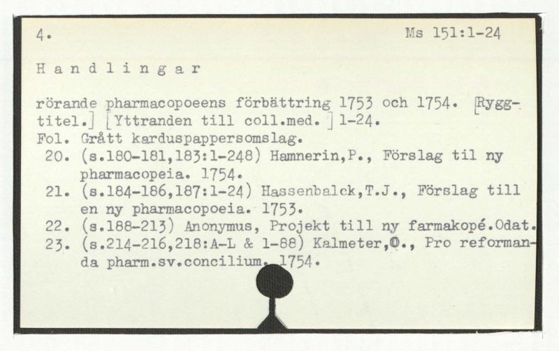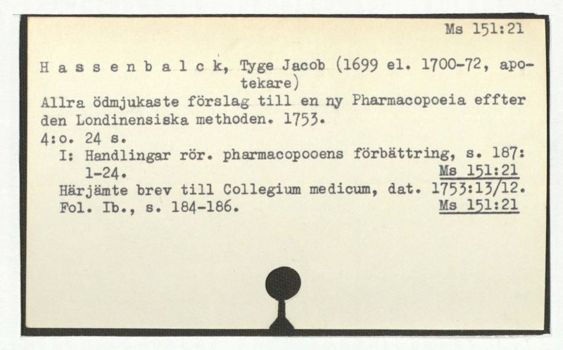 21. (s.184-186,187:1-24) Hassenbalck,T.J., Förslag till en ny pharmacopeia. 1753.