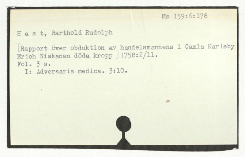 [Rapport över obduktion av handelsmannens i Gamla Karleby Erich Niskansen döda kropp] 1758:2/11.