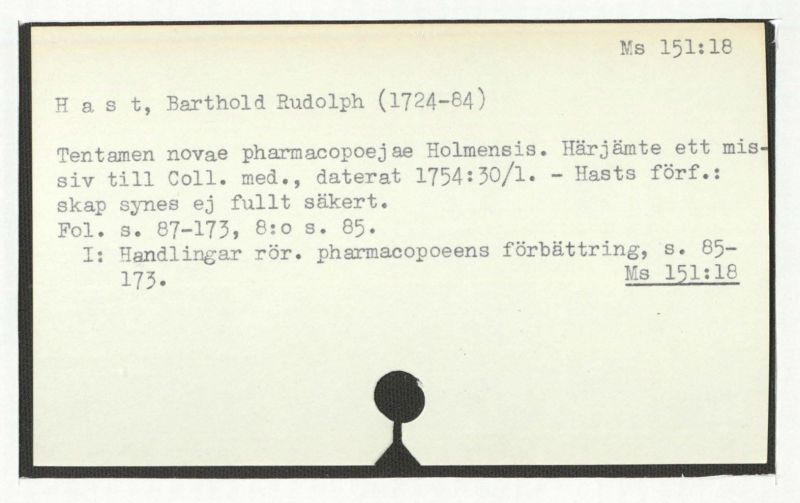 18. (s.85-173) Hast, B.R.? Tentamen novae pharmacoœjæe Holmensis. 1754.