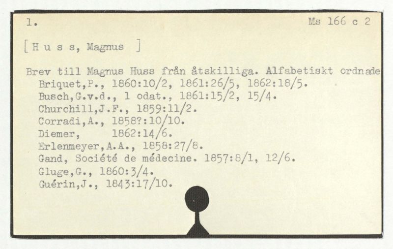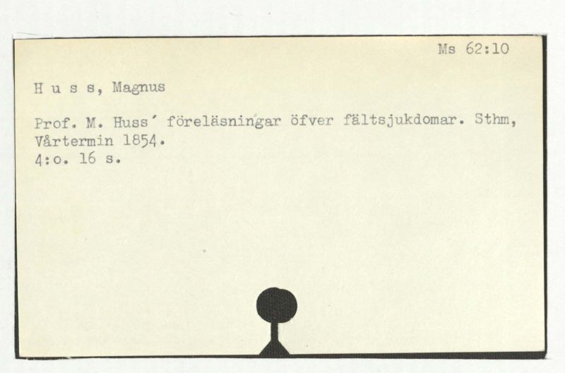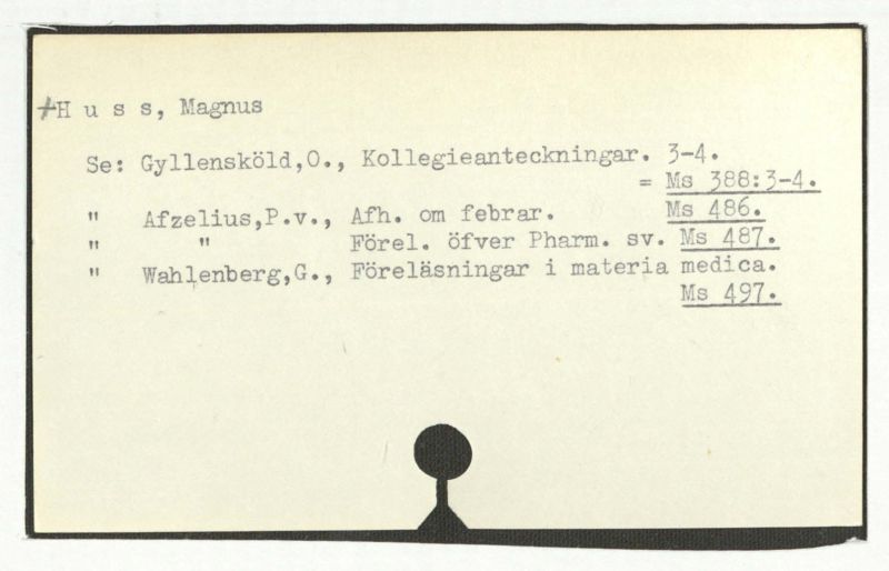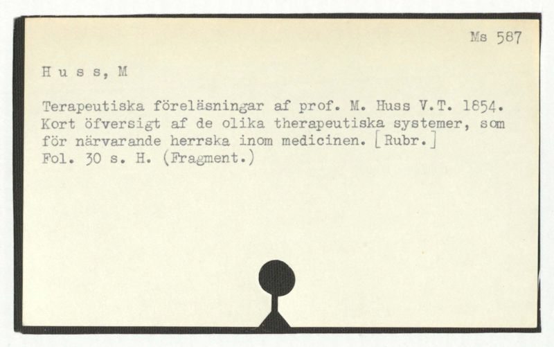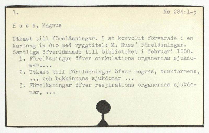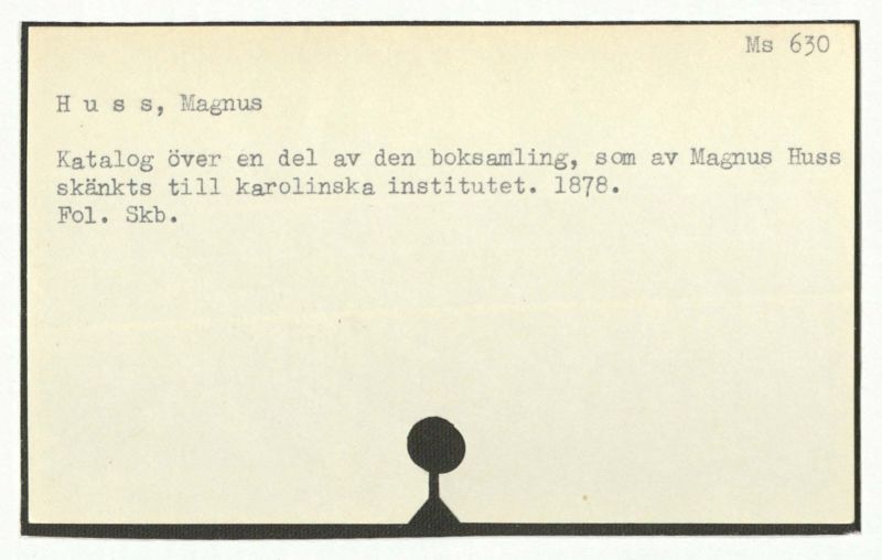 Katalog över en del av den boksamling, som av Magnus Huss skänkts till karolinska institutet. 1878.