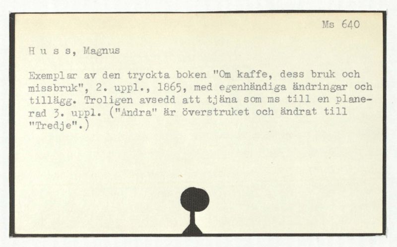 Exempelar av den tryckta boken "Om kaffe, dess bruk och missbruk", 2. uppl., 1865, med egenhändiga ändringar och tillägg. Troligen avsedd att tjäna som ms till en planerad 3. uppl. ("Andra" är överstruket och ändrat till "Tredje".)