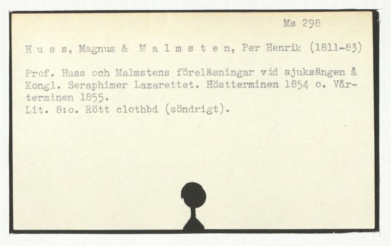 Prof. Huss och Malmstens föreläsningar vid sjuksjälen å Kongl. Seraphimer Lazarettet. Höstterminen 1854 o. Vårterminen 1855.
