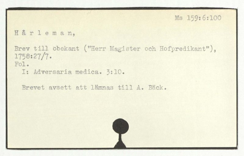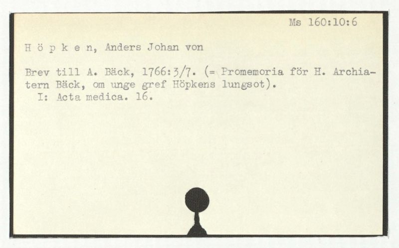 Brev till A. Bäck, 1766:3/7. (= Promemoria för H. Archiatern Bäck, om unge gref Höp Kens lungsot).