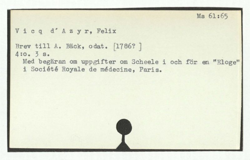 Med begäran om uppgifter om Scheele i och för en "Eloge" i Société Royale de médecine, Paris.