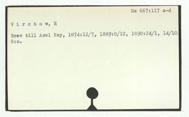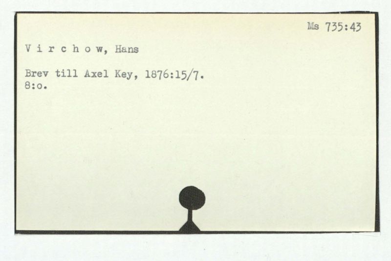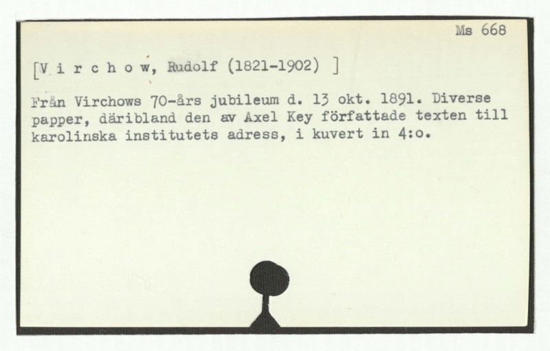 Från Virchows 70-års jubileum d. 13 okt. 1891. Diverse papper, däribland den av Axel Key författade texten till karolinska institutets adress, i kuvert in 4:o.