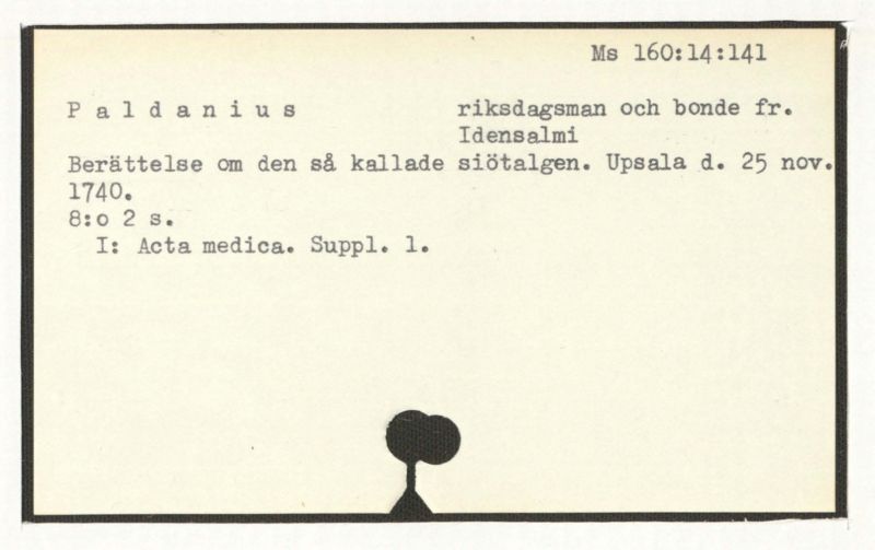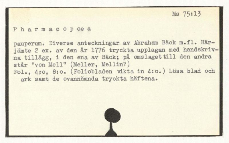 pauperum. Diverse anteckningar av Abraham Bäck m.fl. Här–jämte 2 ex. av den år 1776 tryckta upplagan med handskriv-na tillägg, i den ena av Bäck; på omslaget till den andra står "von Mell" (Meller, Mellin?)