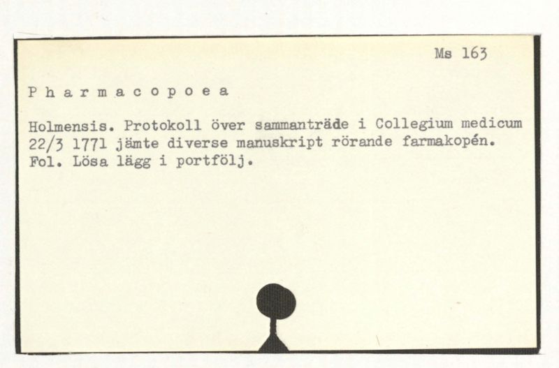 Holmensis. Protocoll över sammanträdde i Collegium medicum 22/3 1771 jämte diverse manuskript rörande farmakopén.