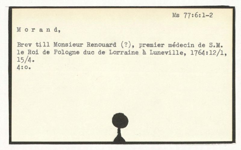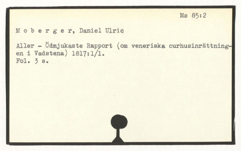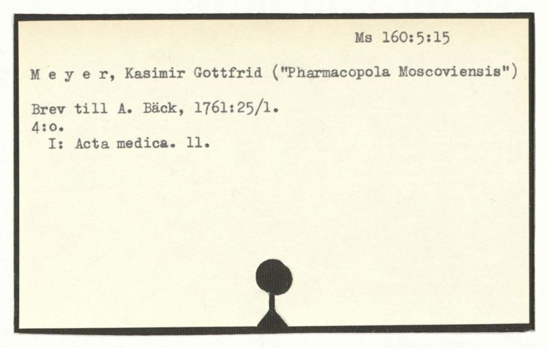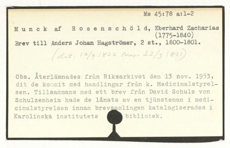 Obs. Återlämnades från Riksarkivet den 13 nov. 1953, dit de kommit med handlingar från k. Medicinalstyrelsen. Tillsammans med ett brev från David Schulz von Schulzenheim hade de lånats av en tjänstemän i medicinalstyrelsen innan brevsamlingen katalogiserades i Karolinska institutets bibliotek.