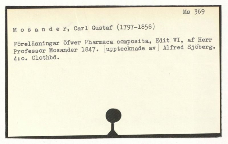 Föreläsningar öfwer Pharma ca composita, Edit VI, af Herr Professor Mosander 1847. [upptecknade av] Alfred Sjöberg.