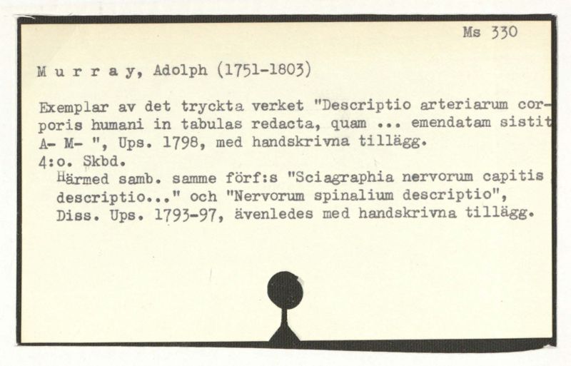Härmed samb. samme förf:s "Scialographia nervorum capitis descriptio..."" och "Nervorum spinalium descriptio", Diss. Ups. 1793-97, ävenledes med handskrivna tillägg.