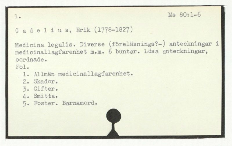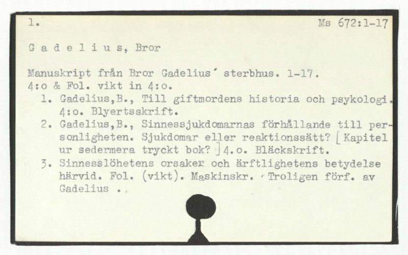 1. Gadelius, B., Till giftmordens historia och psykologi. 4:o. Blyertsskrift.
