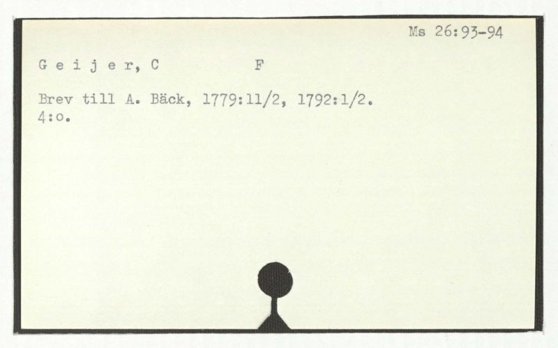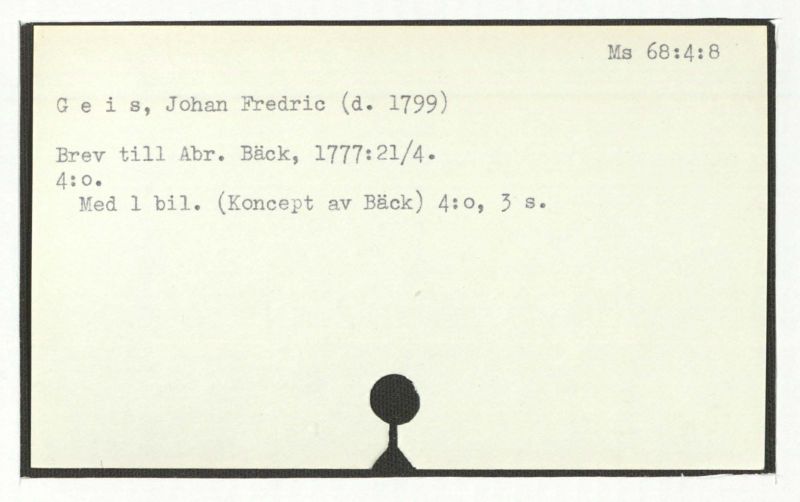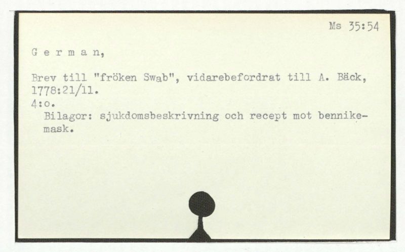 Brev till "fröken Swab", vidarebefordrat till A. Bäck, 1778:21/11.