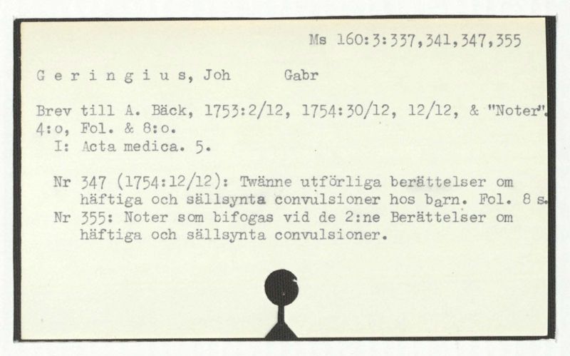 Nr 347 (1754:12/12): Twåne utförliga berättelser om häftiga och sällsynta convulsioner hos barn. Fol. 8 s.