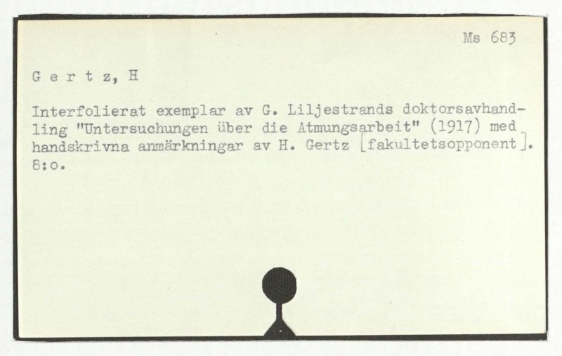 Interfolierat exemplar av G. Liljestrands doktorsavhandling "Untersuchungen über die Atmungsarbeit" (1917) med handskrivna amärkningar av H. Gertz [fakultetsopponent]. 8:0.