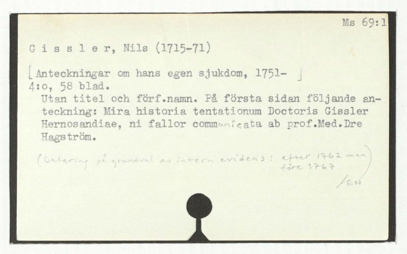 Ut an titel och förf.namn. På första sidan följande anteckning: Mira historia tentationum Doctoris Gissler Hernosandiae, ni fallor comunicata ab prof.Med.Dre Hagström.