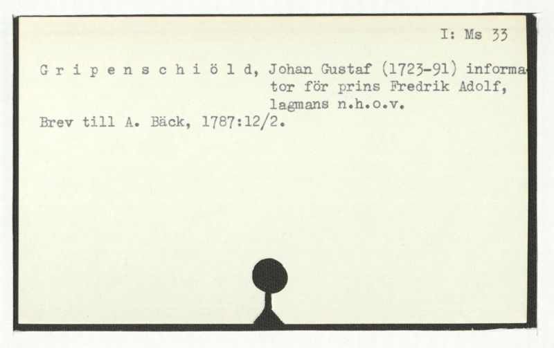 Gripenschiold, Johan Gustaf (1723-91) informa tor för prins Fredrik Adolf, lagmans n.h.o.v.