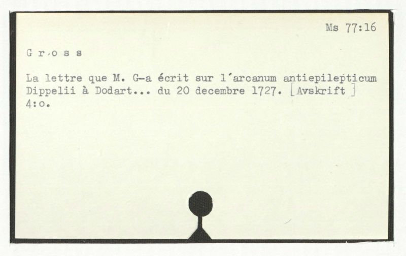 La lettre que M. G-a écrit sur l'arcanum antiepilepticum Dippelii à Dodart... du 20 decembre 1727. [Avskrift]
