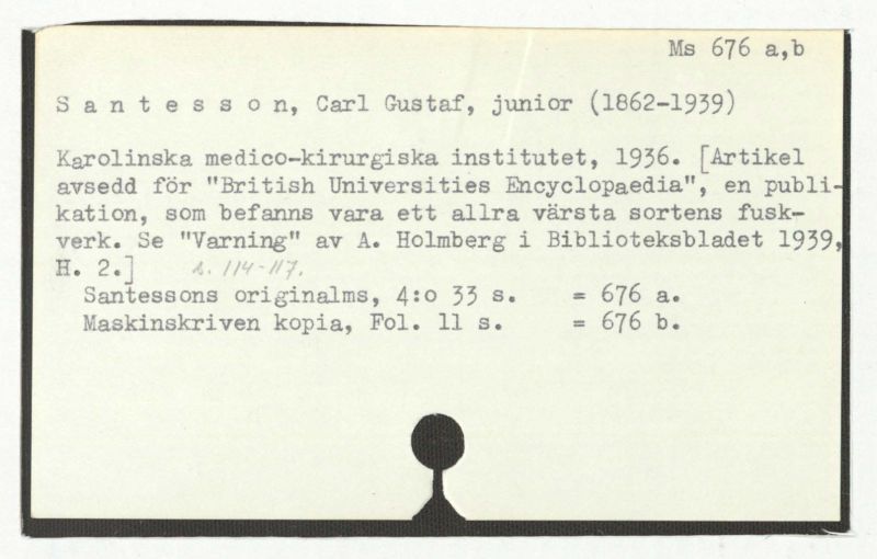 Karolinska medico-kirurgiska institutet, 1936. [Artikel avsedd för "British Universities Encyclopaedia", en publikation, som befanns vara ett allra värsta sortens fusk-verk. Se "Varning" av A. Holmberg i Bibliotekskbladet 1939, H. 2.]