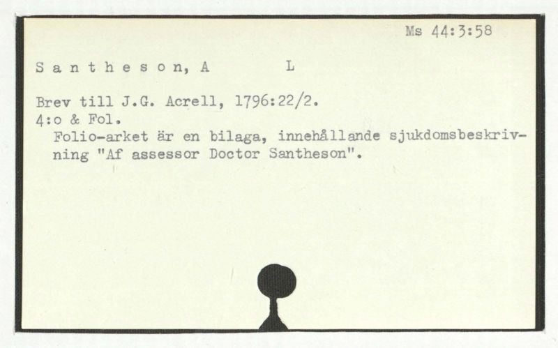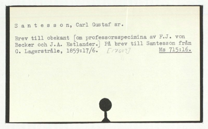 Brevtillobekant[omprofessorspeciminaavF.J. vonBeckerochJ.A. Estlander.] PåbrevtillSantessonfrånG. Lagerstråle, 1859:17/6. [1760?] Ms 715:16.