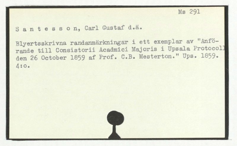 Blyertsskrivna randammärkningar i ett exemplar av "Anförande till Consistorii Acadmici Majoris i Upsala Protocoll den 26 October 1859 af Prof. C.B. Mesterton." Ups. 1859. 4:o.