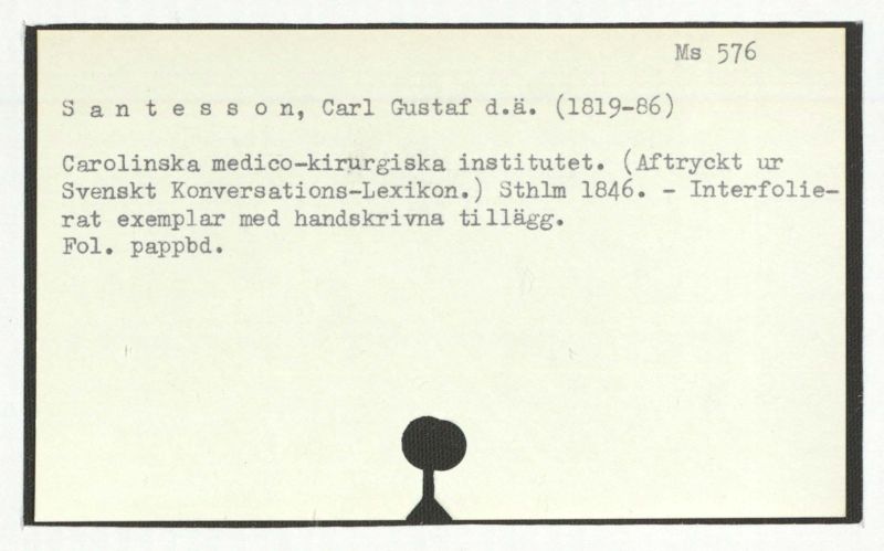 Carolina medico-kirurgiska institutet. (Aftryckt ur Svenskt Konversations-Lexikon.) Sthlm 1846. – Interfolierat exemplar med handskrivna tillägg.