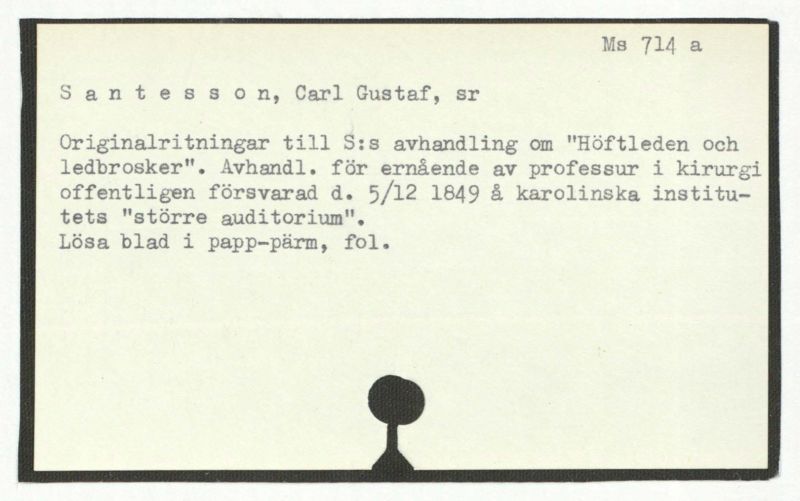 Originalritningar till S:s avhandling om "Höftleden och ledbrosker". Avhandl. för ernående av professur i kirurgi offentligen försvarad d. 5/12 1849 å karolinska institutets "större auditorium".