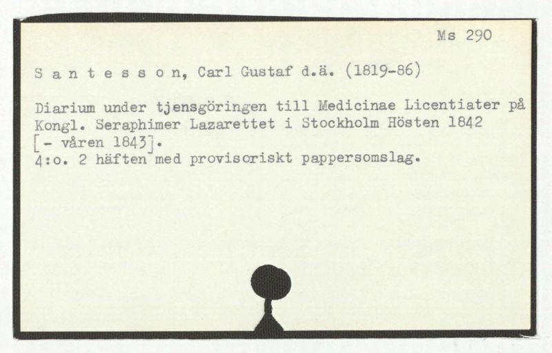 Diarium under tjensgöringen till Medicinae Licentiater på Kongl. Seraphimer Lazarettet i Stockholm Hösten 1842 [– våren 1843].