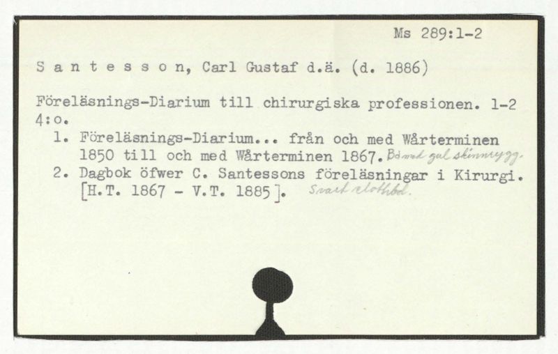 2. Dagbok öfwer C. Santessons föreläsningar i Kirurgi. [H.T. 1867 – V.T. 1885]. Smark eåtbod.
