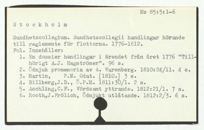 1. En dossier handlingar i ärendet från året 1776 "Tillhörigt A.J. Hagströmer". 96 s.