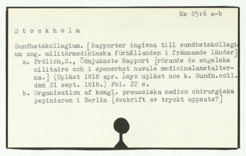 a. Frölich, S., Ödmjukaste Rapport [rörande de engelska militaire och i synnerhet navale medicinalanstalter-na.] (Upläst 1818 apr. Ånyo upläst hos k. Sundh.coll. den 21 sept. 1818.) Fol. 22 s.