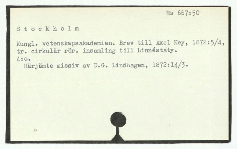 Kungl. vetenskapsakademien. Brev till Axel Key, 1872:5/4, tr. cirkulär rör. insamling till Linnéstaty.